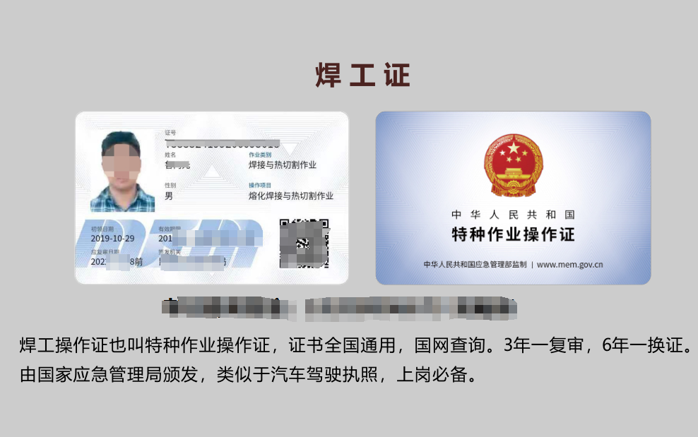 简单记住:只有应急局焊接证才是合法上岗证件!人社局焊工等级证(初级 / 中级 / 高级)是技能职称,不能上岗动火。