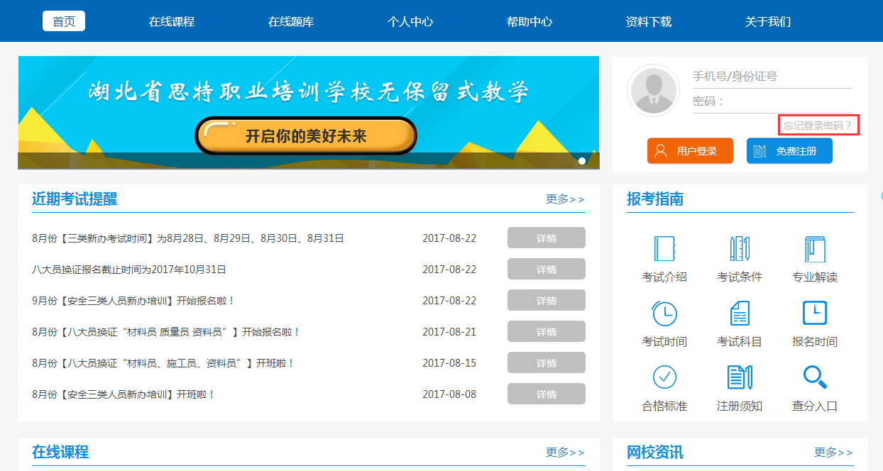 1.如注册时忘记密码,请在首页登录入口点击“忘记登录密码”按钮,可通过注册时手机号验证找回密码,若注册时手机号停用或无法接收短信,请联系我校工作人员,协助找回密码。